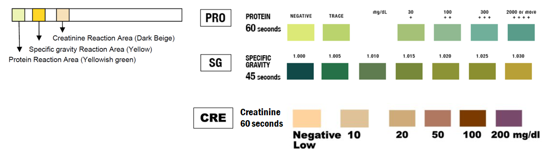 Testen kontrollerer kreatinin, protein og urin-specifik gravitation i urinprøver som et hjælpemiddel til diagnosticering af nyresygdom. Testen giver resultat ved visuel sammenligning med et farveskema, der er trykt på emballagen (se nedenfor).