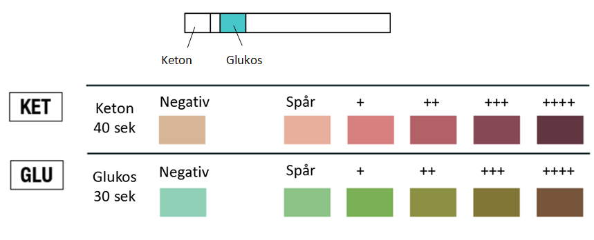 Testet ger resultat genom den visuella jämförelsen med ett färgschema som skrivs ut på produkten. Vidare, varje färg betecknar ett antal koncentrationer av glukos och ketoner (se längst ner).