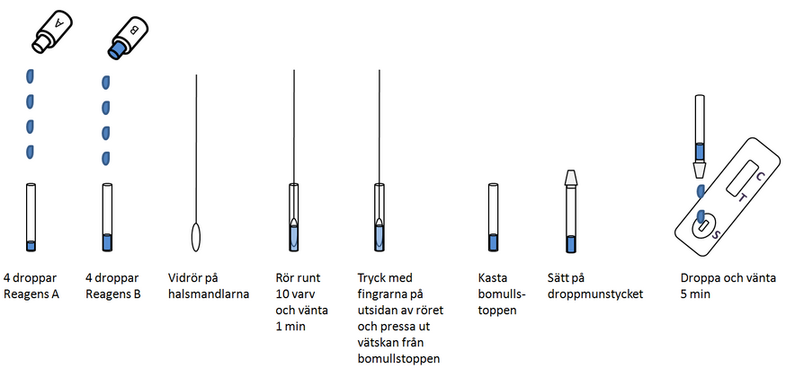 - Ta halspinnen ut förpackningen och rör runt med bomullstoppen på de svullna toncillerna (halsmandlarna) i ett möster liknande en 8a. Se till att båda toncillerna vidrörs. Doppa därefter omedelbart halspinnen till provröret med reagens A och B.